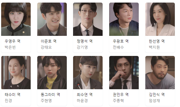 정명석 역은 믿고보는 감초연기, 강기영 배우가 맡았으며 이번 이상한 변호사 우영우에서도 딱딱하면서도 다정하고, 코믹한 정명석의 캐릭터를 훌륭히 소화하고 있다는 믿음이간다.