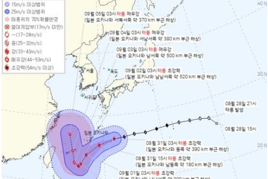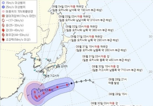그러나 이날(31일) 기상청 예보에는 태풍이 9월5일께 북위 30도에 근접하며 우리 서해 부근과 더 가까운 걸로 표시됐다. 태풍은 왼쪽으로 치우치며 일본보다 우리나라에 가깝게 북상할 경우 직간접 영향이 커질 수 있다.