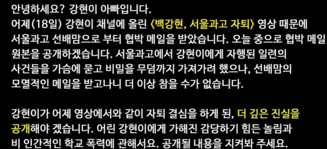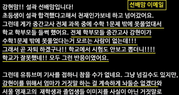 백강현의 아버지는 학교 선배 학부모를 부터 받았다는 메일을 공개하였는데.