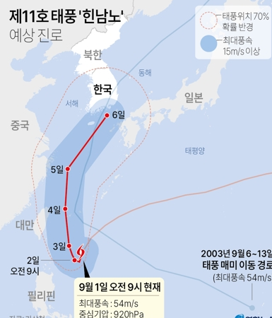 그리고 09월05일 저녁에 남해안 중앙에 힌남노가 상륙할것으로 보고있다.(2003년 매미가 상륙했던 그장소)