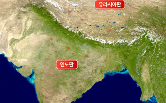 쓰촨성 이곳은 유라시아판과 인도판이 충돌하는 곳으로 히말라야 산맥이 있고, 판경계가 돌출되어있다.