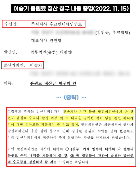 이승기는 법률대리인이 전 소속사 후크엔터테이먼트의 상대로 음원수익 내역 공개와 미정산된 음원료를 정산해줄것을 후크측에 내용증명서를 발송하였다.