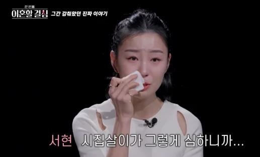명서현의 주장에 따르면 시어머니 시집살에 너무 괴로워 "이층에서 뛰어 내리면 죽을까?"라고 극단적인 생각을 하였다가 약까지 먹었다고 하며, 또한 시어머니는 "내 아들을 고양이 같은 니가 빼앗아 갔잖아"라고 독설을 듣기도 하였다고 한다.
