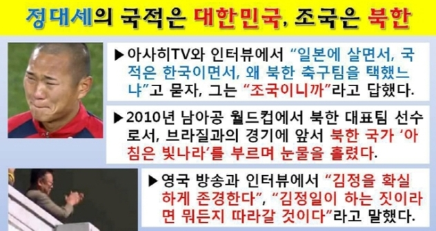 정대세는 조총련계 조선학교에서 교육을 받고 자라서 2007년 부터 북한대표팀으로 뛰게 되었고,