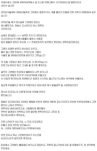 "2016년 제가 계를 타는달에 그 연예인 엄마는 잠수를 탔고
