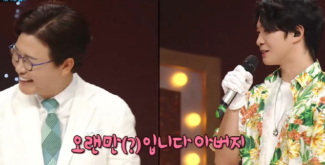 아버지가 너무 바빠 자주 볼수가 없다고 아빠 김성주를 보고 오랜만이라는 아들 민국의 말에 당황하는 김성주