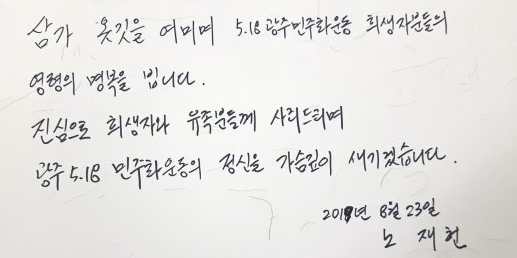 노재헌은 2019년 8월 광주 5.18 민주화 묘역을 찾아 참베하고 희생자와 유가족 광주시민에게 머리숙여 사과하였다.