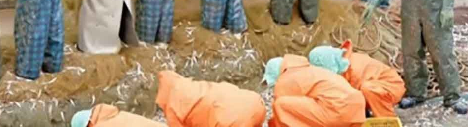 선원들이 멸치를 그물에서 털면 떨어진 멸치를 줍고있는 언니네 산지직송 멤버들
